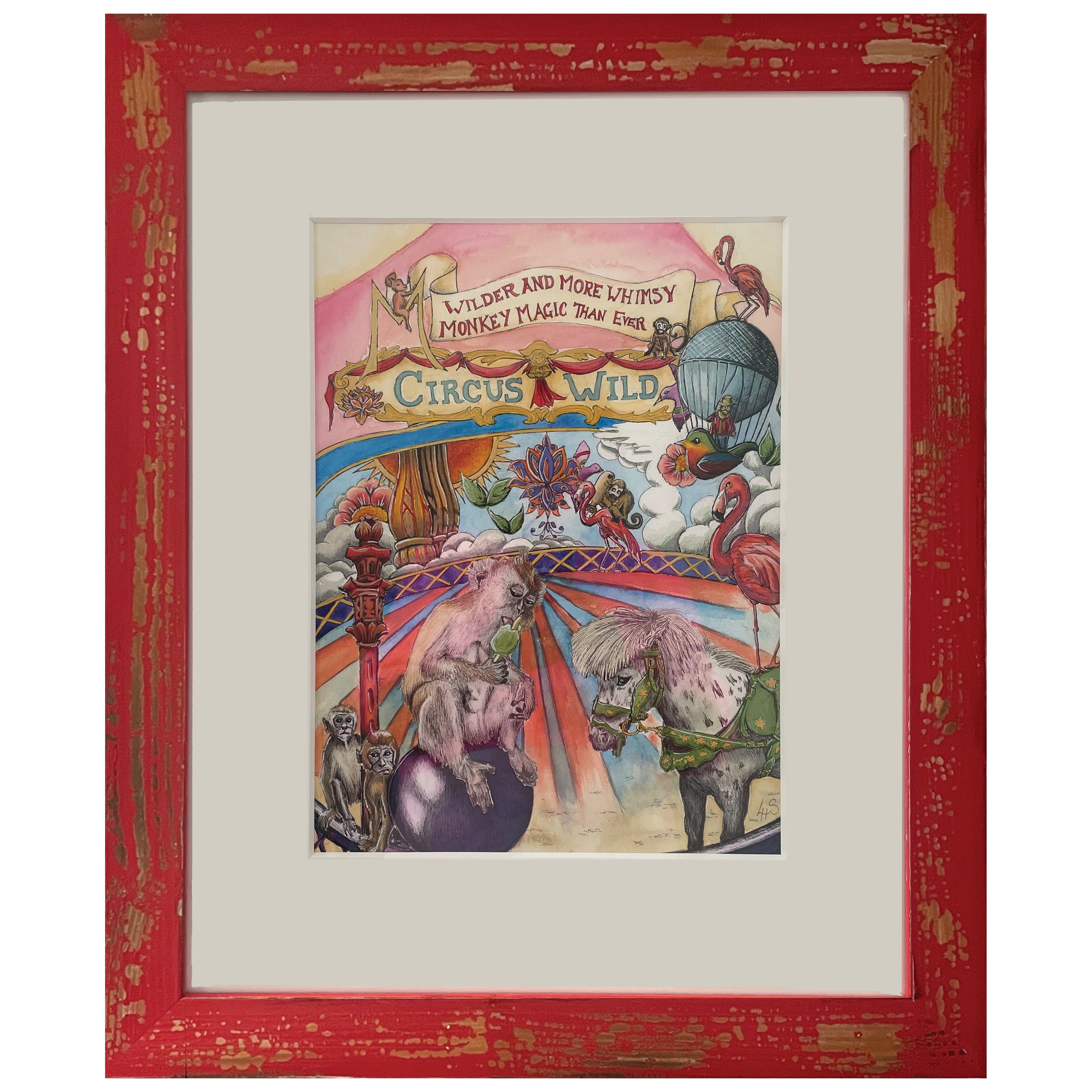 "Circus Wild" is a pen and watercolour celebration of magical joy, inspired by a vibrant photograph of a mischievous monkey enjoying a stolen lollipop at a temple in Thailand, captured by my goddaughter during her travels. To enhance the story, I set the scene within a whimsical circus world, bursting with colour and life—where younger monkeys watch with hopeful eyes, dreaming of their own sugary prizes. The composition channels the energy and theatrical flair seen in Dame Laura Knight’s circus paintings, creating a backdrop that is even more fantastical than the original photo.