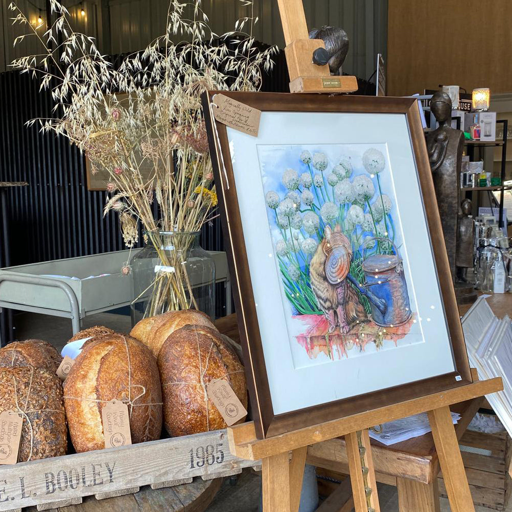 This pen and watercolour piece captures a joyful moment in my kitchen garden, inspired by a favourite photograph of my beloved cat Margot as she affectionately rubs her face against a watering can among wild, exuberant alliums. The playful clusters of white flowers—each a happy sphere atop thick stalks—contrast with the soft elegance of Margot and the rich, shifting hues of the composition. I love exploring unexpected colour harmonies, so you’ll spot splashes of unlikely tones that challenge the viewer’s eye and add vibrance to the scene. The frame, finished in copper, echoes the warmth and character of the watering can.