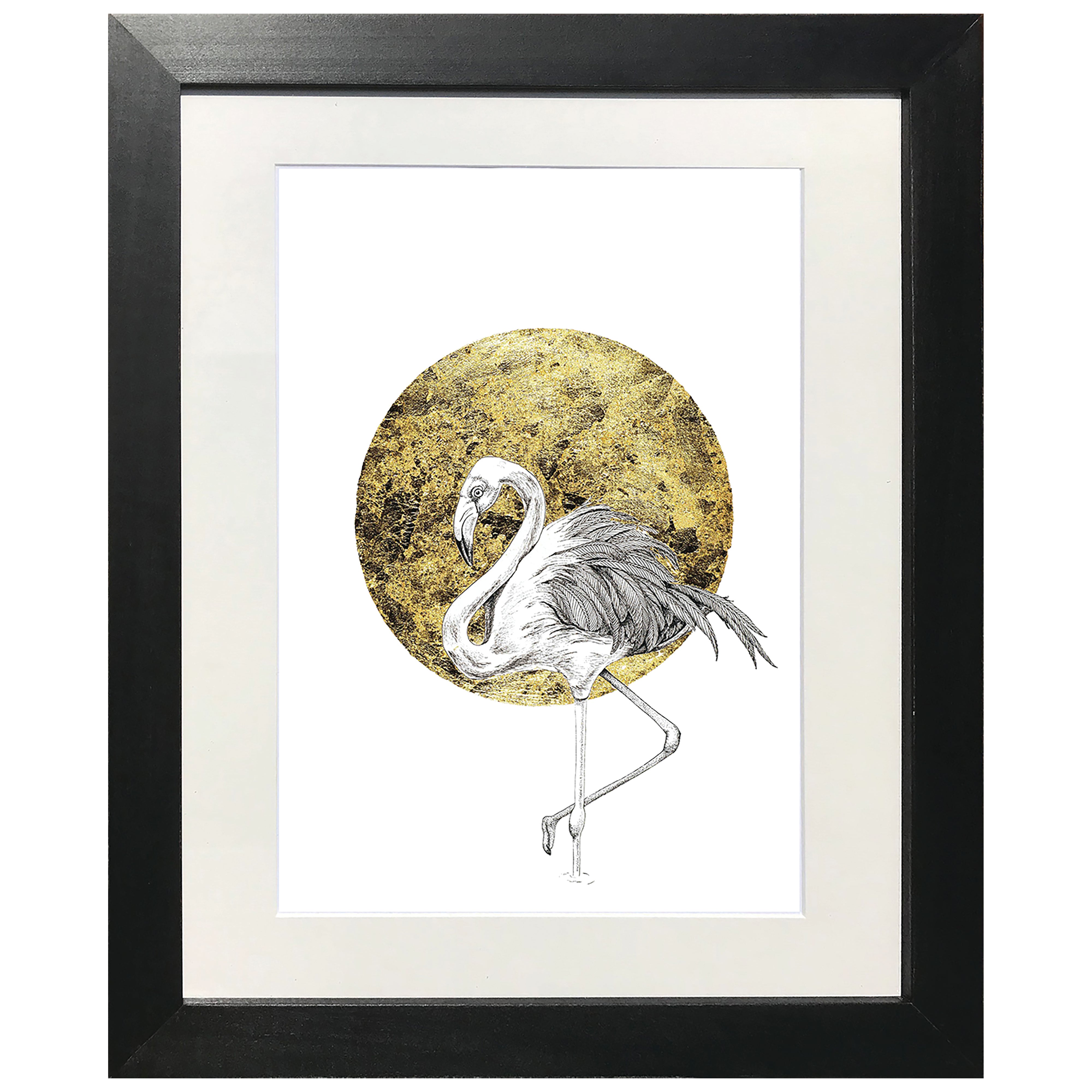 The artwork is presented at A3 size and mounted in a 40 x 50cm frame, making it a striking yet versatile piece for any interior. Perfect as a statement artwork for a living room, bedroom, or gallery wall, Pretty Flamingo celebrates both natural beauty and refined craftsmanship.