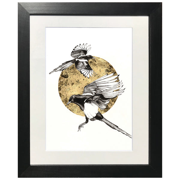 Celebrate beauty, symbolism, and artistry with Two for Joy, an elegant depiction of two magpies perched together in perfect harmony. Drawn in exquisite pen and ink, the fine detailing captures the character and spirit of these striking birds, while delicate touches of gold leaf add a radiant shimmer that changes with the light.